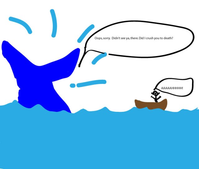 As you can see, the entirety of my downstairs could fit inside a blue whale. If you stacked two blue whales on top of each other, they would be my house. I could install a nice stairway between the two, and it would be exactly like living in my house (except moist and fishy, which I am proud to say my house is not). Whales are THAT big, and they’re just down there, churning through the dark, all big and monster-like. You can’t see what they’re doing, what they’re about to do. They could be hanging around near the bottom one second, and then decide they’re feeling a little vitamin D deficient and barrel to the surface the next. I’m aware (despite my fang depiction) that they’re most likely not the next incarnation of Jaws 3–mindful killing machines with a fixed, personal interest in filtering me to death. What matters is that don’t matter. This size advantage is clearly the whale’s. It is just going to do what it’s trying to do, and if I’m in the way, too damn bad. The whale is not going to see me, and even if it does at the last second, that doesn’t mean it won’t accidentally hurt me. Hell, I step on my cats all the time, just because they’re small and have decided to hang out in a place I didn’t expect them to be.